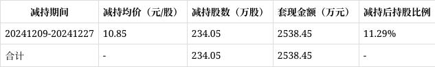 2024年12月9日至2024年12月27日,减持234.05万股,减持套现金额为2538.45万元。本次减持过后,上海华谊集团持股比例降至11.29%。