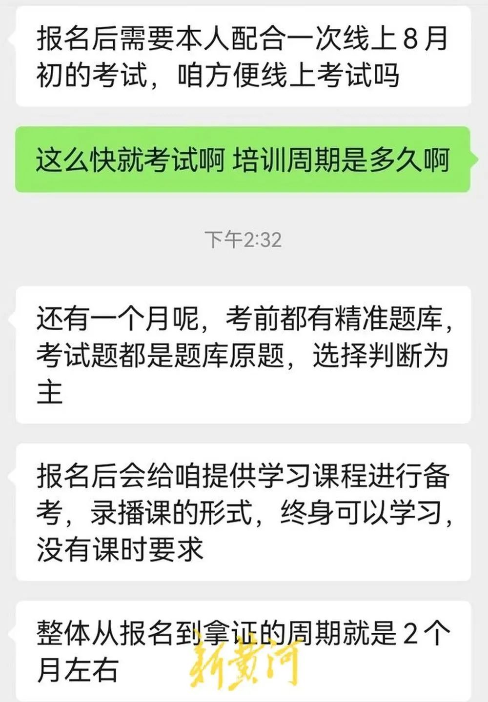 记者以“国学讲师”考证的名义在网上咨询了几家证书培训机构,其中河南学思教育公司工作人员向记者提供了一份培训提纲,其中包含“道教”“佛教”“阴阳家和道家”“墨家与法家”等十余门课程,并建议记者参加8月份的考试。记者质疑学习时间太短,但对方称,考前都有精准题库,考试题都是题库原题,选择判断为主,只要多看看通过率能达到80%以上,并表示从报名到拿证的周期就是2个月左右。
