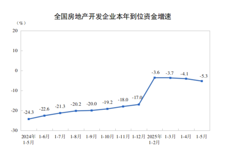 国家统计局数据显示,1—5月份,房地产开发企业房屋施工面积625020万平方米,同比下降9.2%。其中,住宅施工面积435354万平方米,下降9.6%。房屋新开工面积23184万平方米,下降22.8%,降幅比1-4月收窄0.5个百分点。其中,住宅新开工面积17089万平方米,下降21.4%,降幅收窄0.9个百分点。房屋竣工面积18385万平方米,下降17.3%。其中,住宅竣工面积13337万平方米,下降17.6%。
