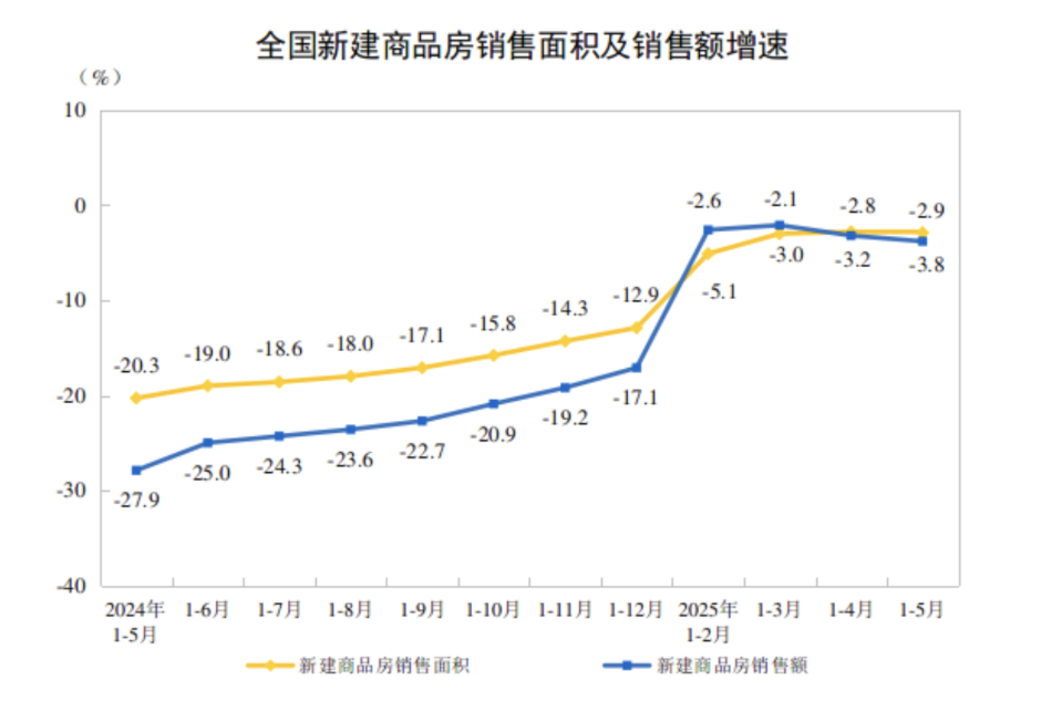 国家统计局数据显示,1—5月份,新建商品房销售面积35315万平方米,同比下降2.9%;其中住宅销售面积下降2.6%。新建商品房销售额34091亿元,下降3.8%;其中住宅销售额下降2.8%。